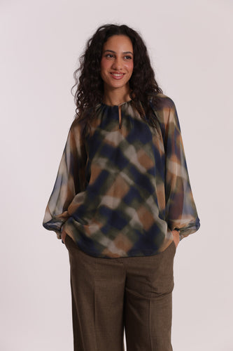 blusa scollo tondo fantasia check - mimì muà - blu cammello